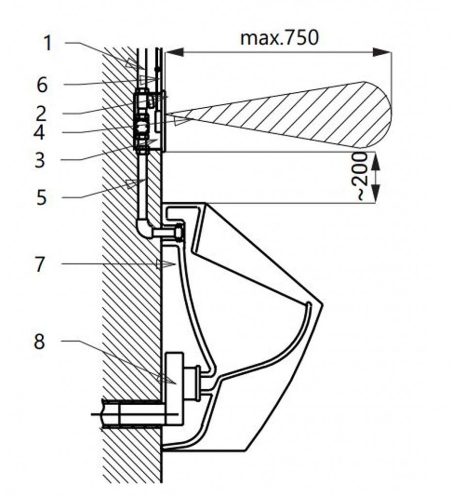 reaguje na prítomnosť osoby pred pisoárom vo vzdialenosti max. 0,7 m od snímača po dobu dlhšiu ako 7,5 s