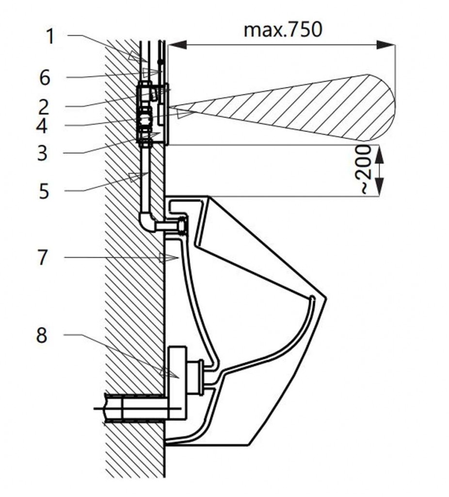 reaguje na prítomnosť osoby pred pisoárom vo vzdialenosti max. 0,7 m od snímača po dobu dlhšiu ako 7,5 s