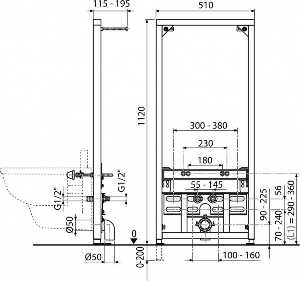 - rozmery (š / h / v): 510 x 115 - 195 x 1120 mm