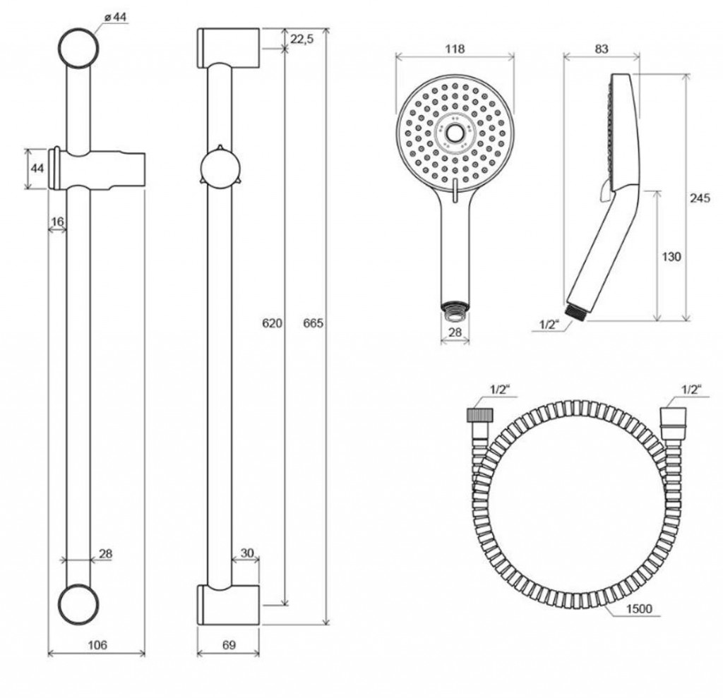 - sprchová tyč: 600 mm, s posuvným držiakom sprchy