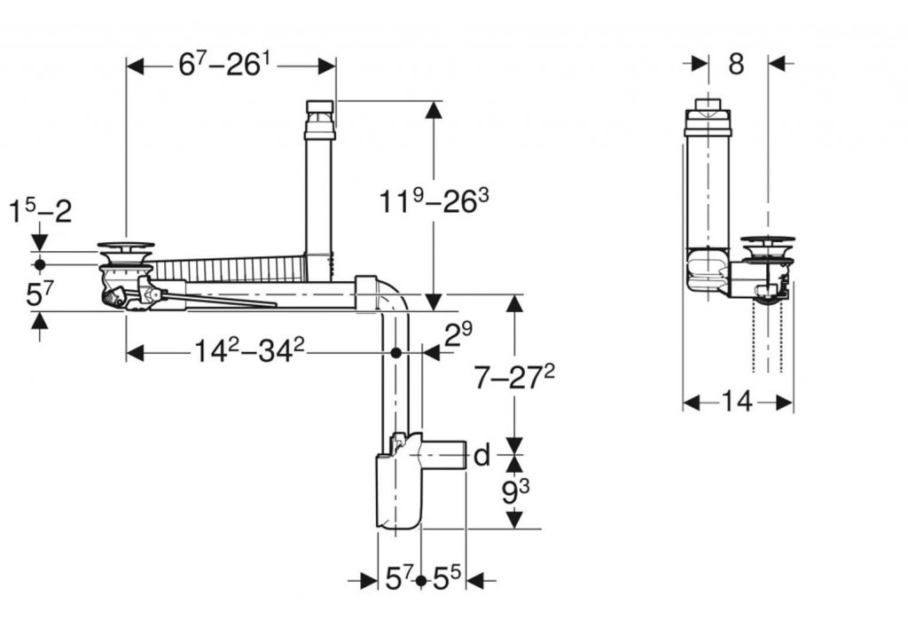 Odtok umývadla Geberit Clou, priestorovo úsporný, úzke prevedenie, s pákovým ovládaním a krytom odtoku d=32mm