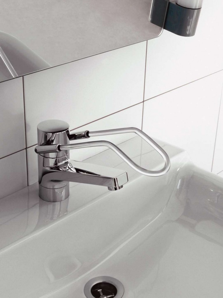 Umývadlo s integrovaným madlom, vhodné pre osoby s telesným postihnutím.