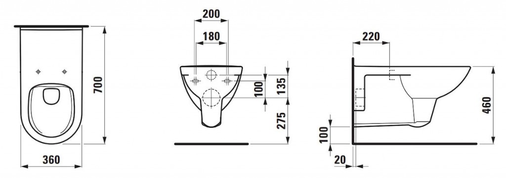 - inštalácie: zavesením na stenu, pre výšku460 mm
