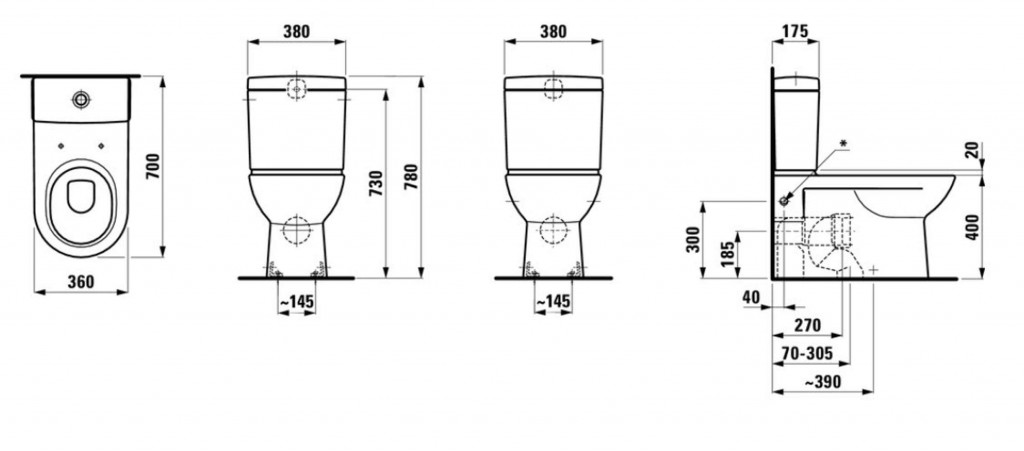 - inštalácie: usadením na podlahu, kapotovanej prevedenie k stene, 2 otvory pre upevnenie