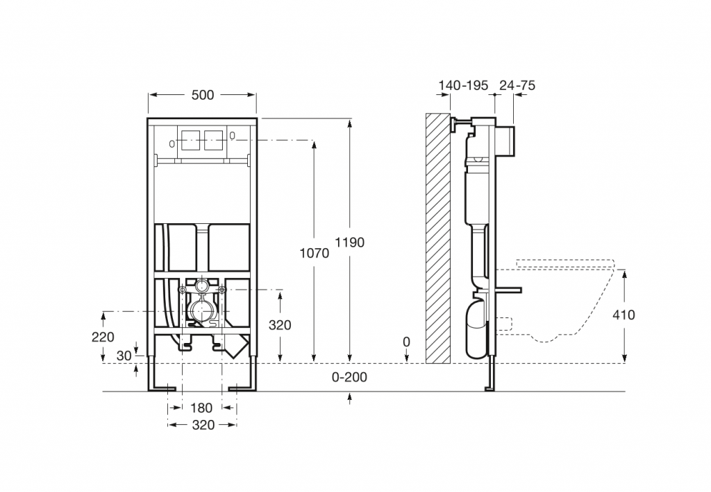 Podomietkový rámový modul so zabudovanou hadičkou pre prívod vody, do ľahkej priečky pre závesné WC, Dual Flush 6 / 3l, nastaviteľné i na 4,5 / 3l, výška 1190 mm, odpadové koleno ø 90/110 mm.