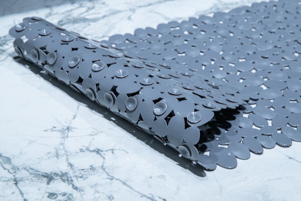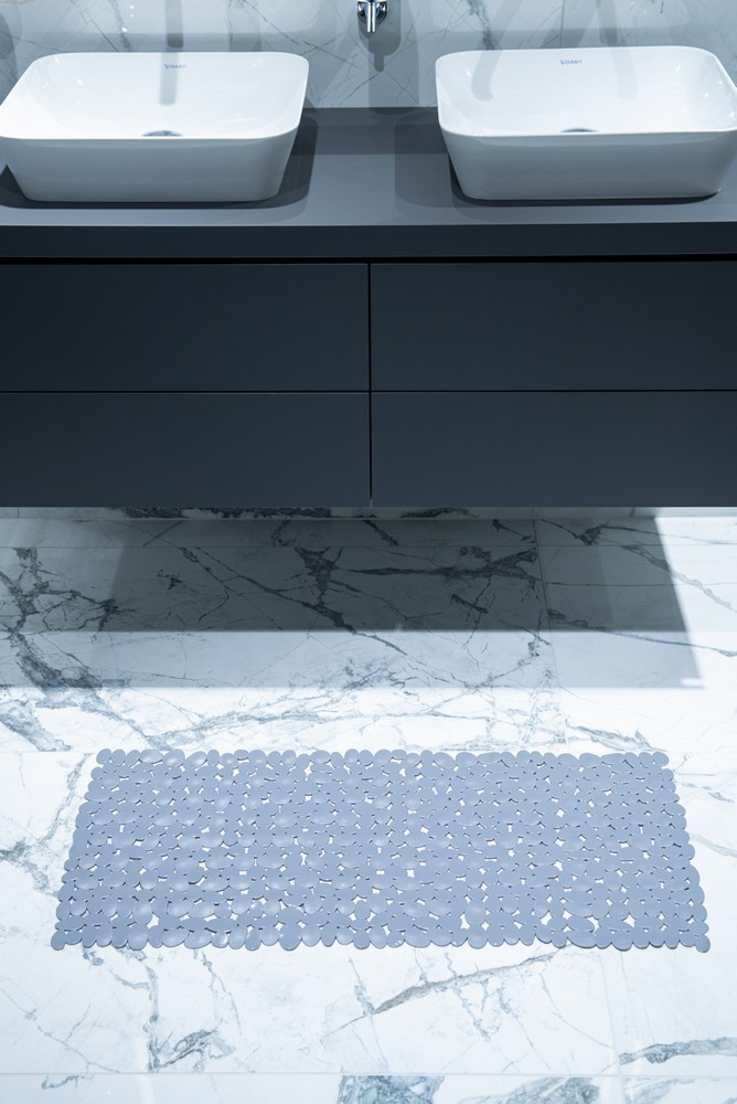 Obdĺžniková, šedá kúpeľňová predložka s kamienkovým motívom. Má protišmykové prísavky na zaistenie bezpečnosti v kúpeľni. Čistiť na 30 stupňov, nežehliť, chemicky nečistiť, nebieliť, nesušiť v sušičke.