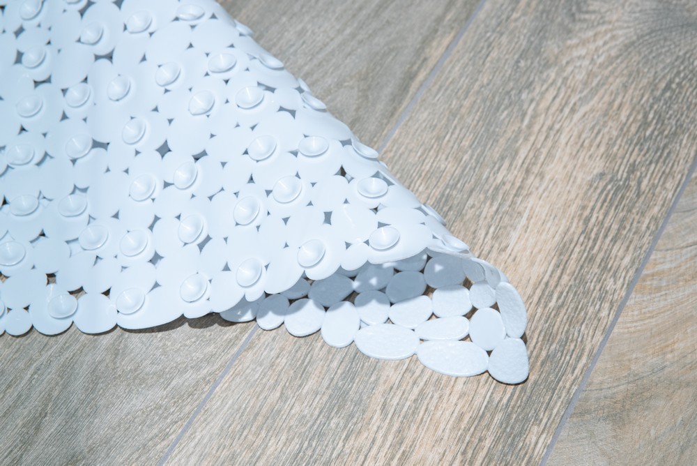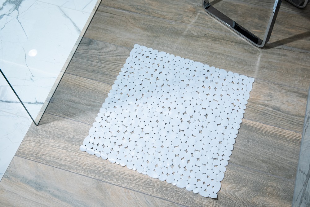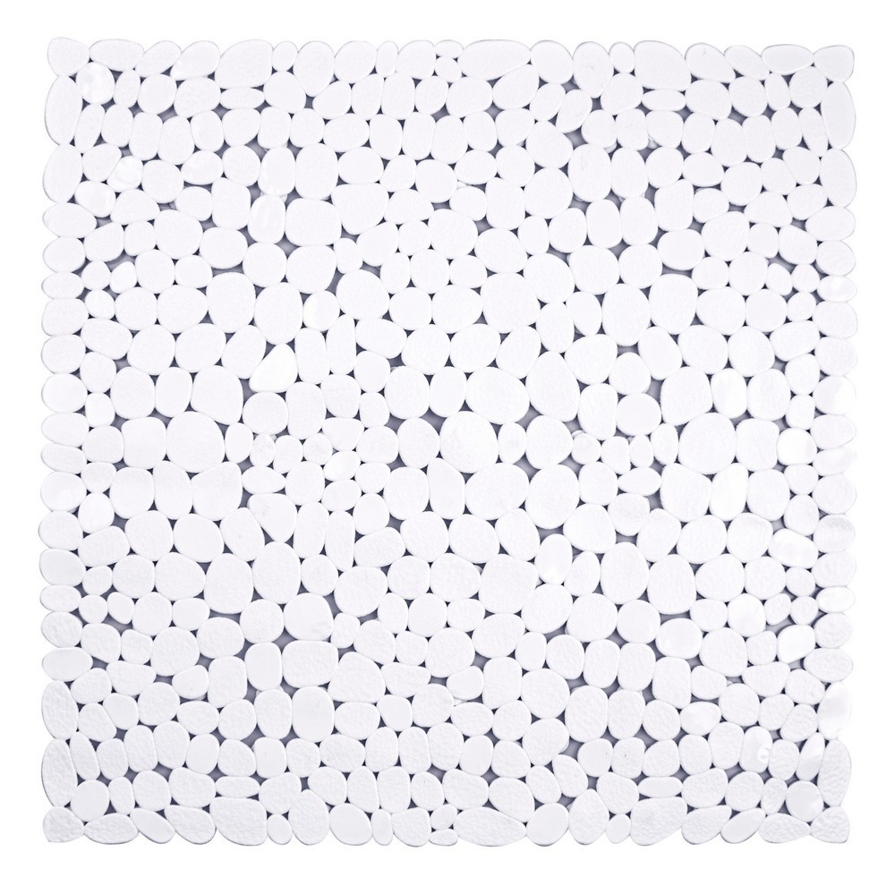 Štvorcová, biela kúpeľňová predložka s motívom okruhliakov. Má protišmykové prísavky na zaistenie bezpečnosti v kúpeľni. Štvorcová kúpeľňová predložka sa odporúča pre sprchové vaničky. Čistiť na 30 stupňov, nežehliť, chemicky nečistiť, nebieliť, nesušiť v sušičke.