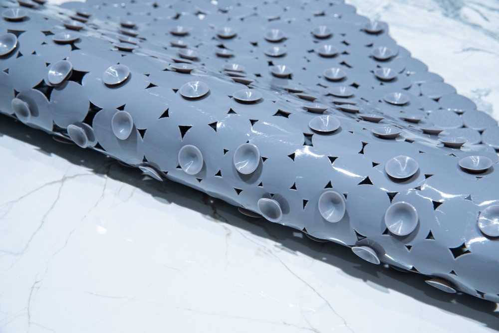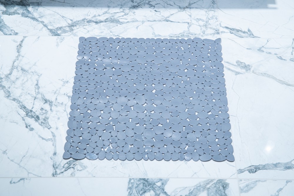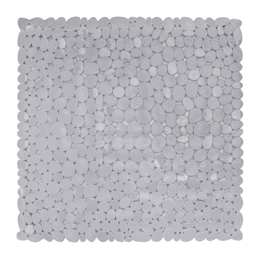 Štvorcová, šedá kúpeľňová predložka s motívom okruhliakov. Má protišmykové prísavky na zaistenie bezpečnosti v kúpeľni. Štvorcová kúpeľňová predložka sa odporúča pre sprchové vaničky. Čistiť na 30 stupňov, nežehliť, chemicky nečistiť, nebieliť, nesušiť v sušičke.