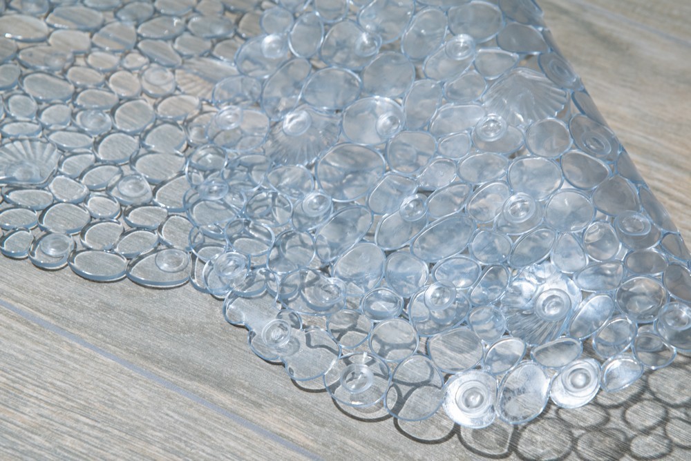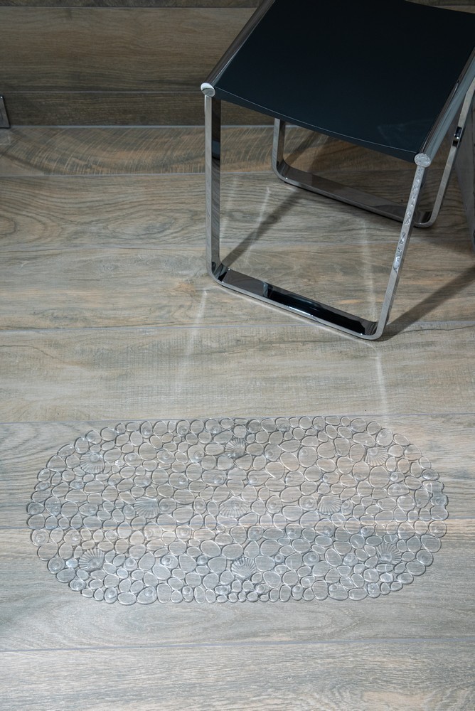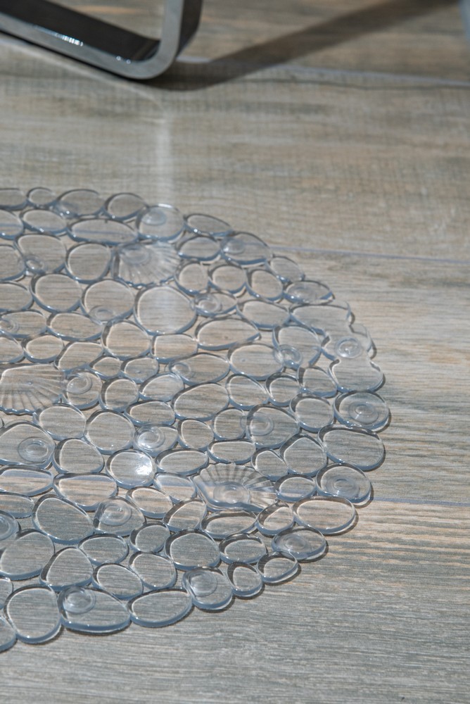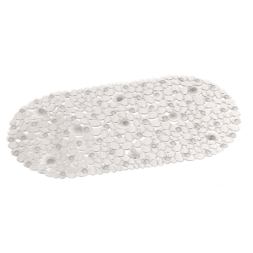 Priehľadná oválna predložka do kúpeľne. Protišmykové, opatrené prísavkami na spodnej strane. Podlhovastá kúpeľňová predložka sa odporúča najmä do vane. Čistiť na 30 stupňov, nežehliť, chemicky nečistiť, nebieliť, nesušiť v sušičke.