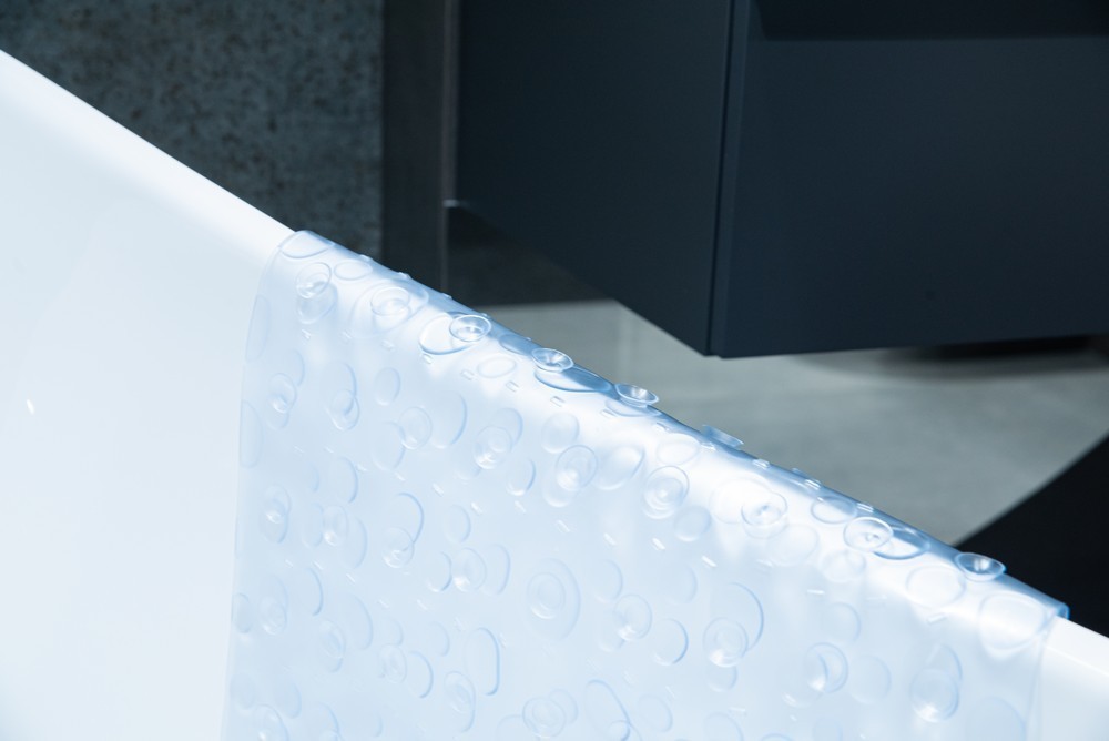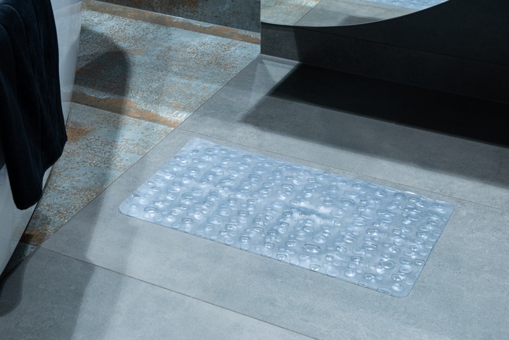 Priehľadná kúpeľňová predložka obdĺžnikového tvaru. Protišmyková podložka do vane má prísavky, ktoré zabraňujú pošmyknutiu. Veľmi ľahko sa udržuje v čistote. Čistiť na 30 stupňov, nežehliť, chemicky nečistiť, nebieliť, nesušiť v sušičke.