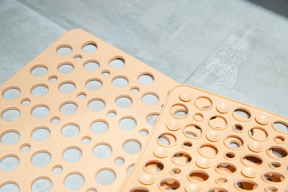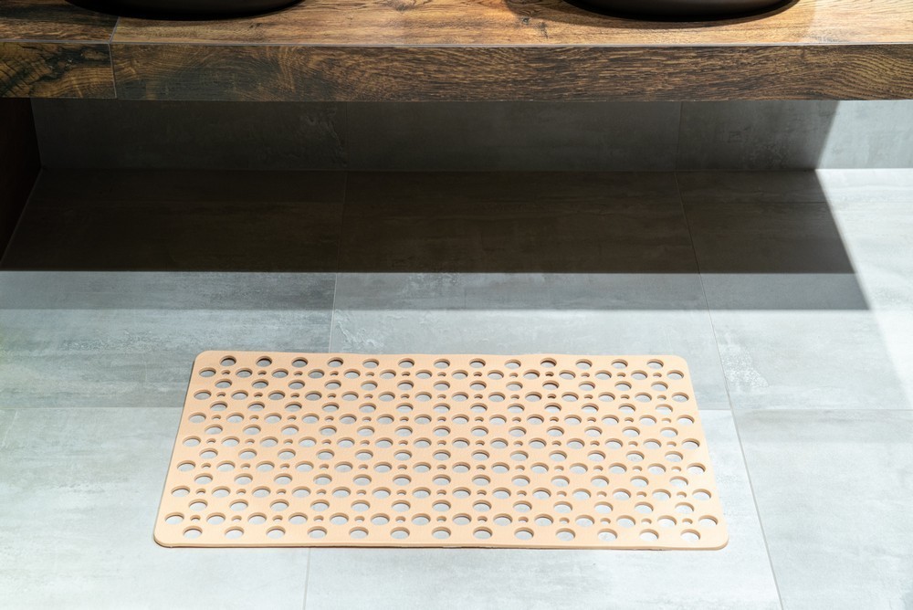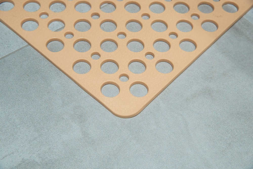 Obdĺžniková, protišmyková kúpeľňová predložka v béžovej farbe. Má špeciálne prísavky, ktoré zabraňujú jeho kĺzaniu po povrchu. Tento model kúpeľňovej predložky vyniká od ostatných tradičných predložiek svojou výškou a špeciálnym dizajnom, vďaka čomu je veľmi príjemný na používanie. Podlhovastý tvar sa perfektne hodí do vane. Kúpeľňová predložka sa veľmi ľahko čistí. Čistiť na 30 stupňov, nežehliť, chemicky nečistiť, nebieliť, nesušiť v sušičke.