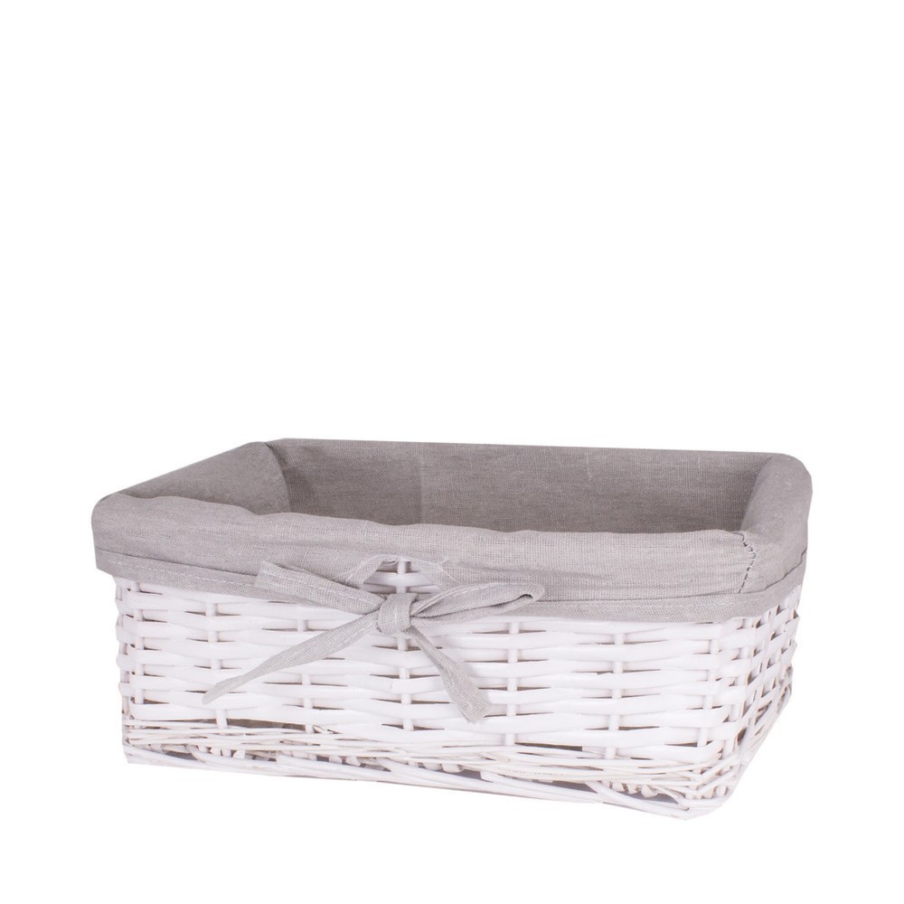 Prútený košík na menšie predmety. Vnútro je podšité bavlneným plátnom. Vpredu má ozdobnú kravatu v podobe mašle, ktorá mu dodáva kúzlo.