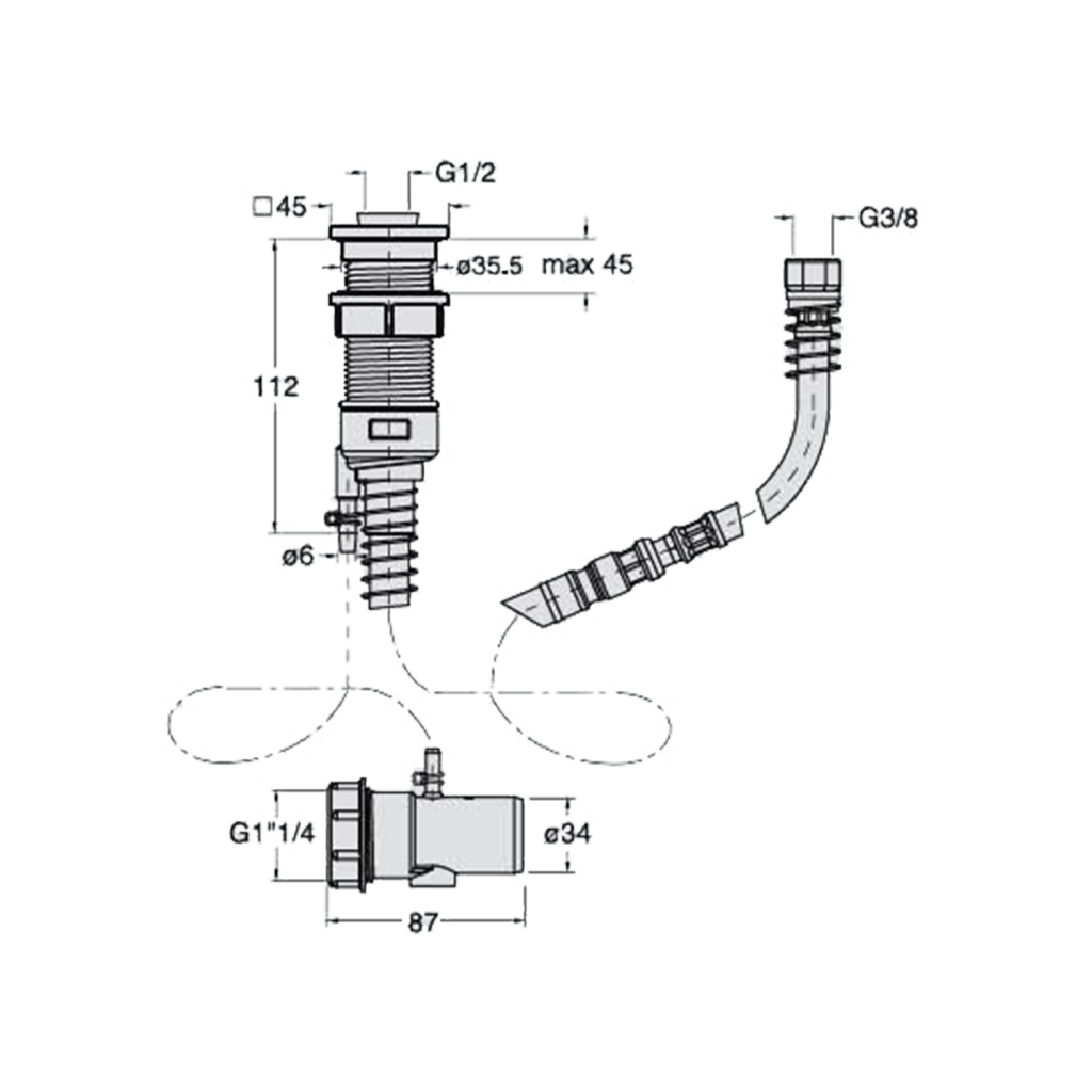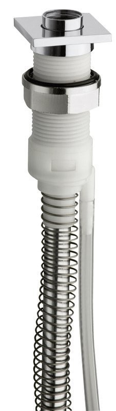 Systém výsuvu hadice pre montáž na hranu vane. Ručná sprcha sa vratnou pružinou navracia späť a zároveň je hadica osušená. Systém navyše pomocou drenáže zamedzuje zatekaniu vody pod vaňu.