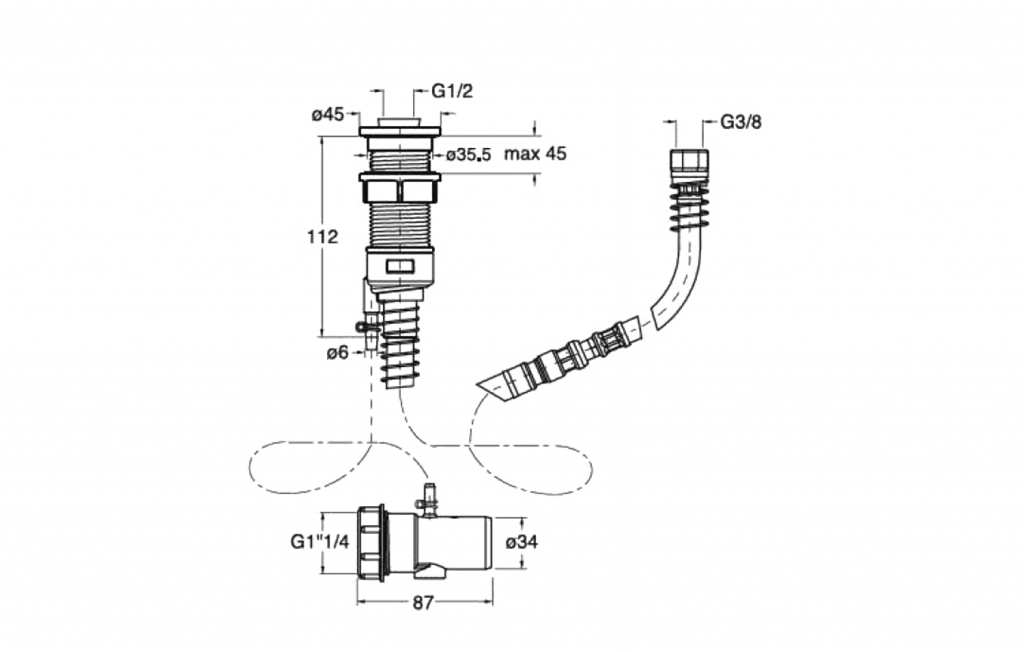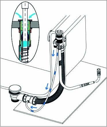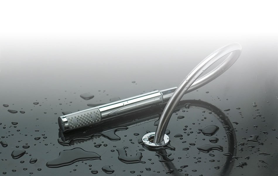 Systém výsuvu hadice pre montáž na hranu vane. Ručná sprcha sa vratnou pružinou navracia späť a zároveň je hadica osušená. Systém navyše pomocou drenáže zamedzuje zatekaniu vody pod vaňu.