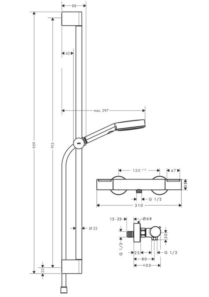 - otočný a výškovo nastaviteľný jazdec na uchytenie ručnej sprchy
