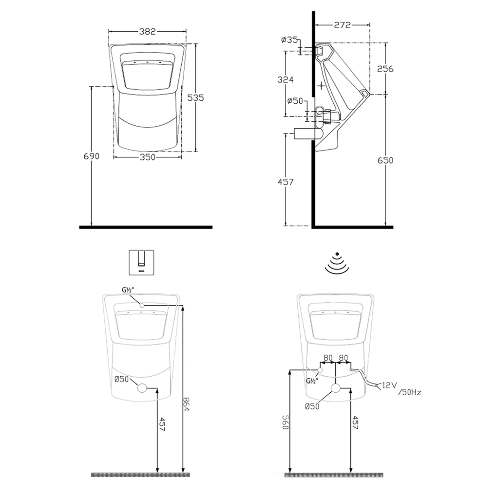 - Při instalaci s automatickým splachovačem PS002 je nutné instalovat i napájecí zdroj (PS05T nebo PS10T).