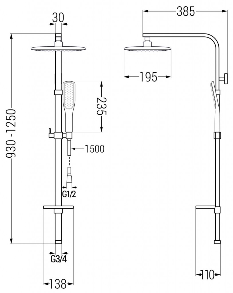 Rozmery držiaka sú: šírka lišty 30 mm, výška 930-1250 mm a hĺbka od steny je 385 mm.