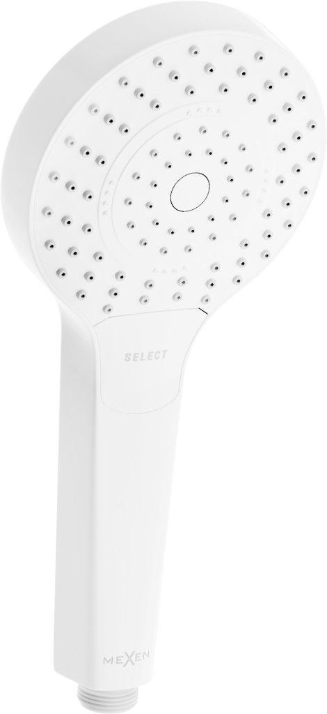 Plastová ručná sprcha od výrobcu MEXEN s tromi funkciami, ktoré je možné ovládať len pomocou jedného tlačidla SELECT a štandardným pripojením G 1/2". Rozmery: výška: 230 mm, priemer hlavy: 108 mm. Vybavená je povrchovou úpravou v rôznych farebných variantoch. Gumové trysiek, ktorými je ručná sprcha vybavená, zabraňujú usadzovaniu vodného kameňa.