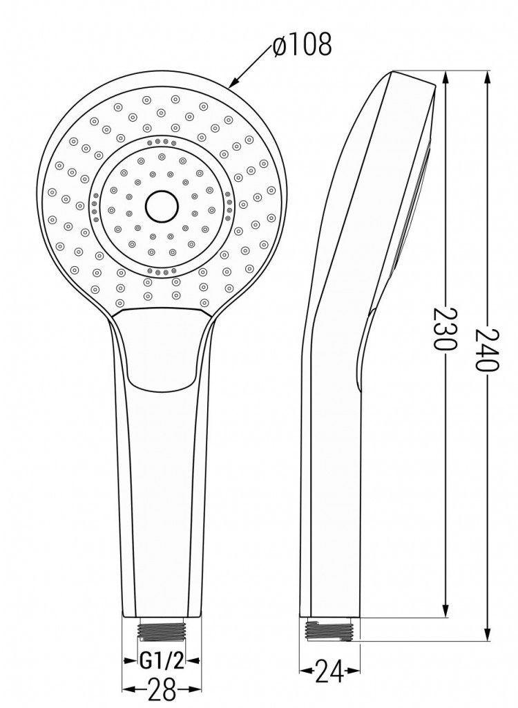 Plastová ručná sprcha od výrobcu MEXEN s tromi funkciami, ktoré je možné ovládať len pomocou jedného tlačidla SELECT a štandardným pripojením G 1/2". Rozmery: výška: 230 mm, priemer hlavy: 108 mm. Vybavená je povrchovou úpravou v rôznych farebných variantoch. Gumové trysiek, ktorými je ručná sprcha vybavená, zabraňujú usadzovaniu vodného kameňa.