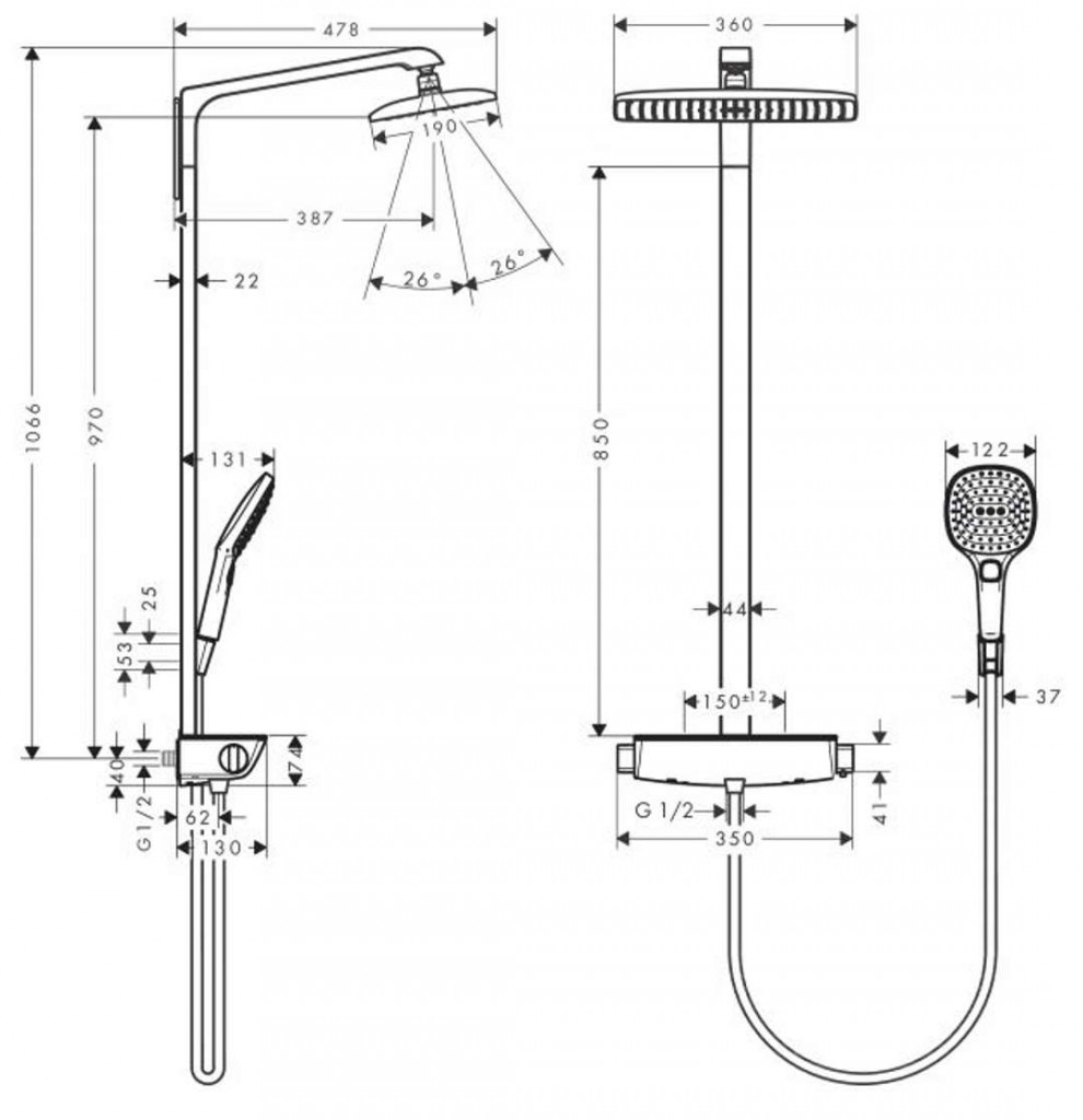 - guľový kĺb: nastaviteľný uhol horné sprchy