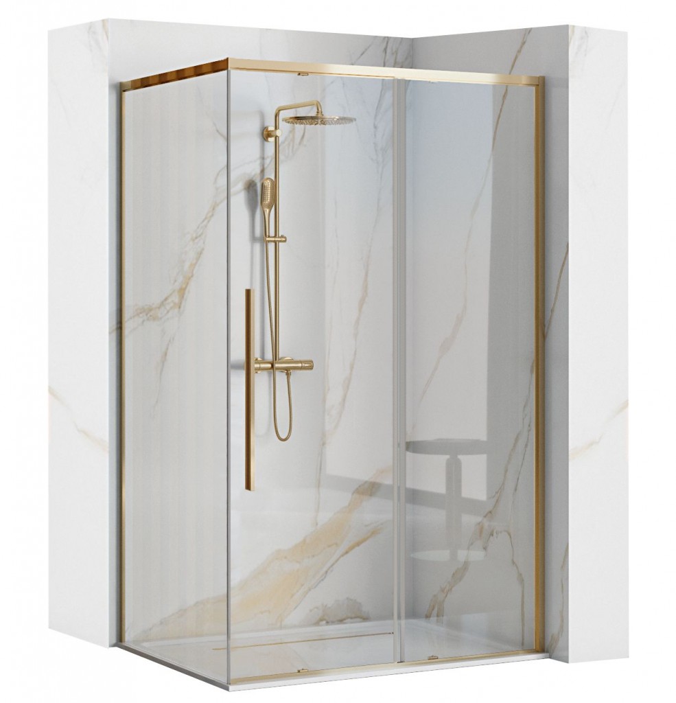 Moderný, minimalistický ani industriálny štýl kúpeľne sa nezaobíde bez rovnako ladeného sprchovacieho kúta. Zlaté hliníkové profily decentne rámujú 6mm tvrdené sklo, ktoré zaistí vzdušnosť a čistotu priestoru.