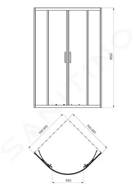 Štvrťkruhový sprchovací kút posuvné dvere rozmer steny: 790 - 810 mm šírka vstupu: 450 mm výška: 1850 mm rádius: 450 mm bezpečnostné sklo, hrúbka 4 mm výplň: číre sklo strieborné lesklé profily Inštalácia na sprchovú vaničku, ktorá nie je súčasťou d… (celý popis)