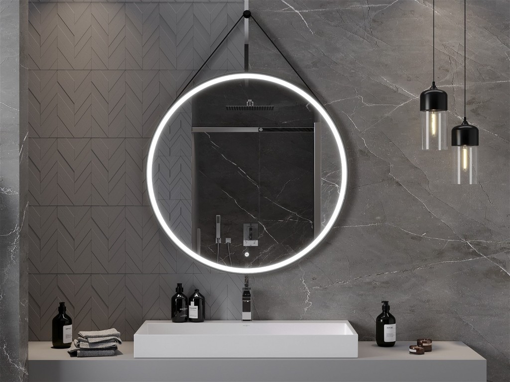 Moderné a jednoduché okrúhle zrkadlo kolekcie RENI s opaskom je vybavené LED podsvietením, ktoré sa ľahko ovláda pomocou dotykového tlačidla priamo na ploche zrkadla . Zrkadlo je vybavené vyhrievacou podložkou ANTI-CAR , ktorá eliminuje zahmlenie skla.