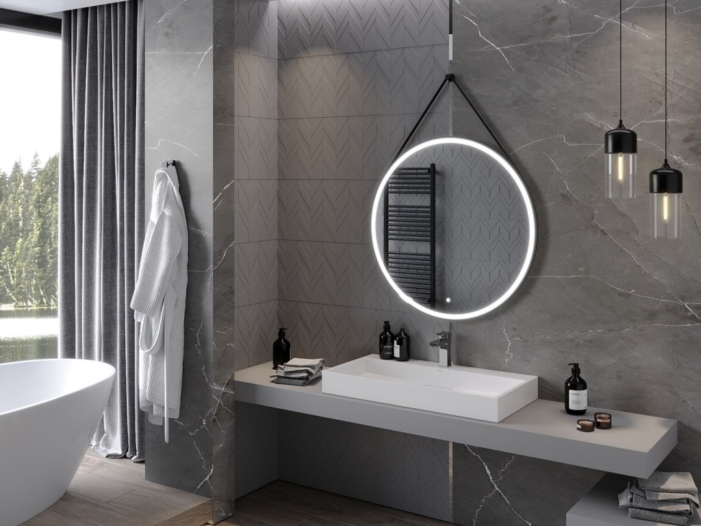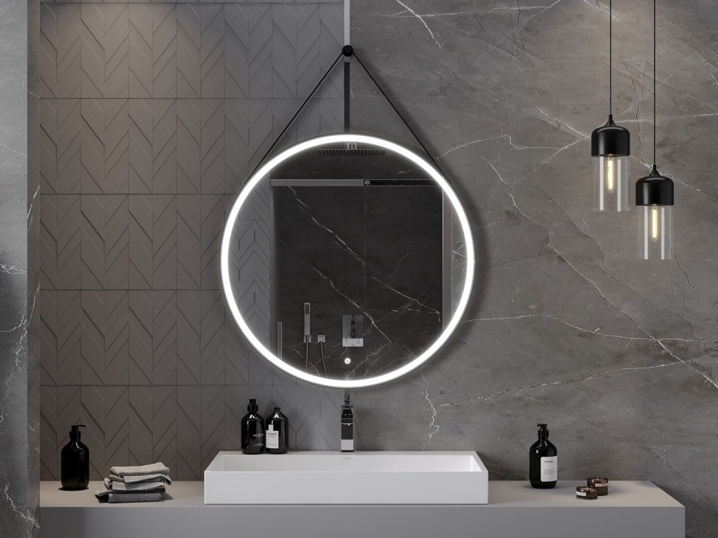 Moderné a jednoduché okrúhle zrkadlo kolekcie RENI s opaskom je vybavené LED podsvietením, ktoré sa ľahko ovláda pomocou dotykového tlačidla priamo na ploche zrkadla . Zrkadlo je vybavené vyhrievacou podložkou ANTI-CAR , ktorá eliminuje zahmlenie skla.