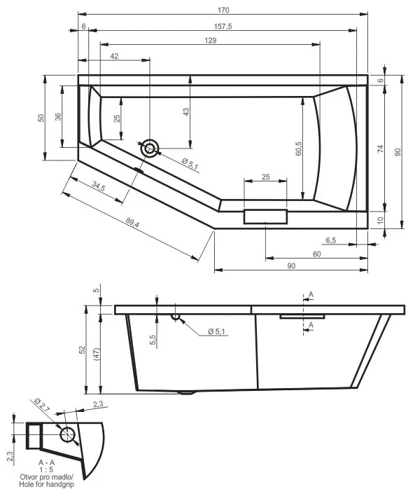 RIHO GETA 170x90x50 Ľavá biela, bez nôh BA8900500000000