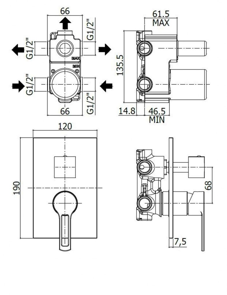 Sprchová páková batéria s otočným prepínačom vrátane podomietkového telesa pre 3 vývody