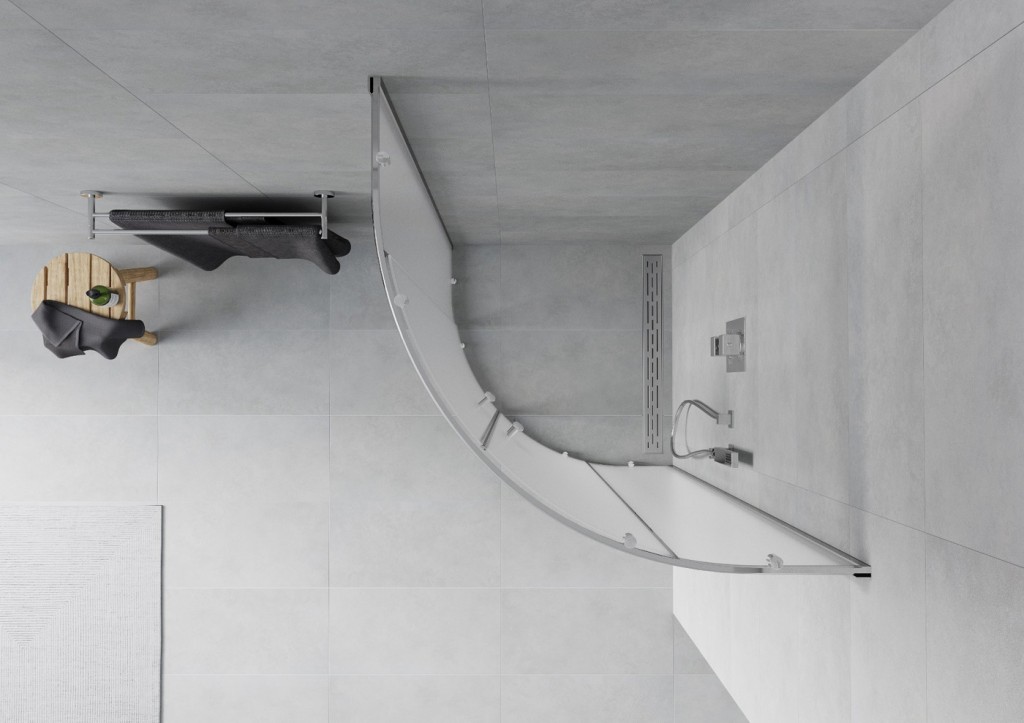 Štvrťkruhový sprchovací kút z kolekcie Mexen RIO . Funkčný posuvný kút so spoľahlivými valčekmi, ktoré zaručujú plynulé a tiché posúvanie. Obliečka na skle uľahčuje ich čistenie, takže si môžete dlhšie užívať dokonale čisté sklo. Sprchový kút má tvrdené, bezpečnostné sklo o hrúbke 5 mm a povrchové prvky sú vyrobené z nerezového materiálu pokrytého povrchovou úpravou. Hliníkový profil s prahom, zaručuje dokonalú tesnosť.