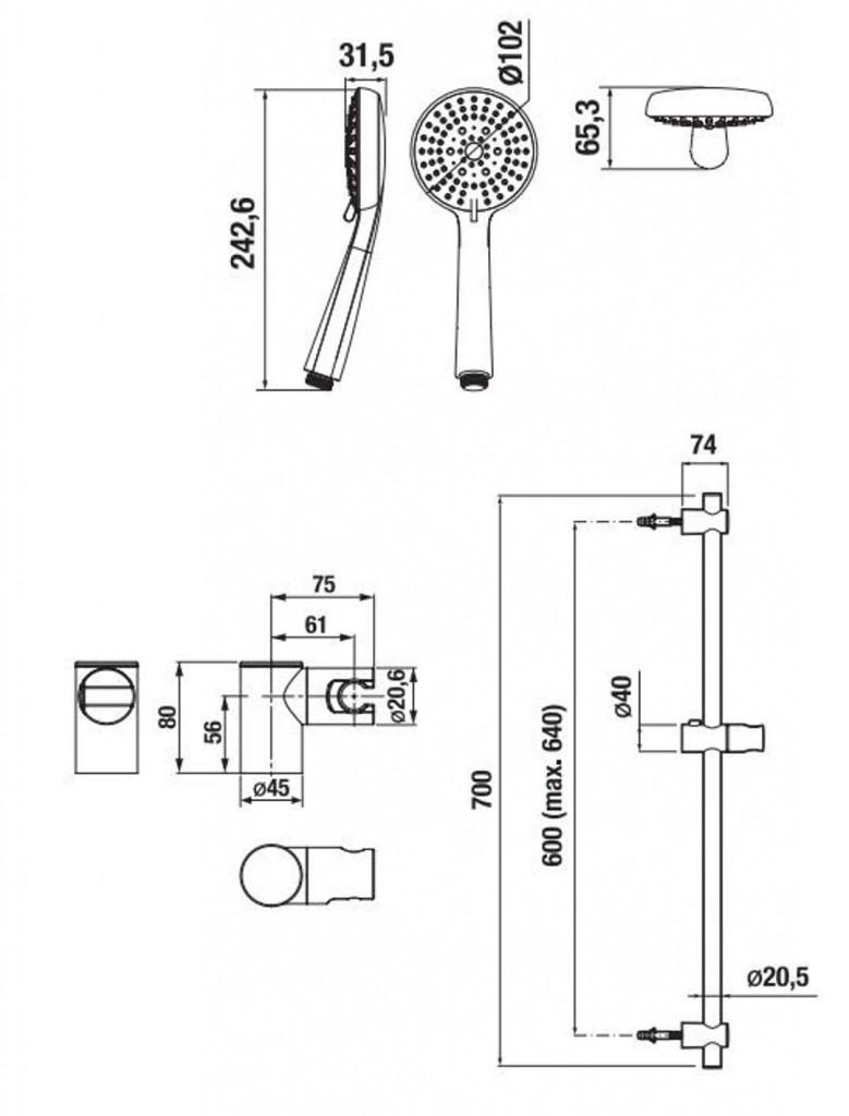 - sprchovú tyč 700 mm, chróm