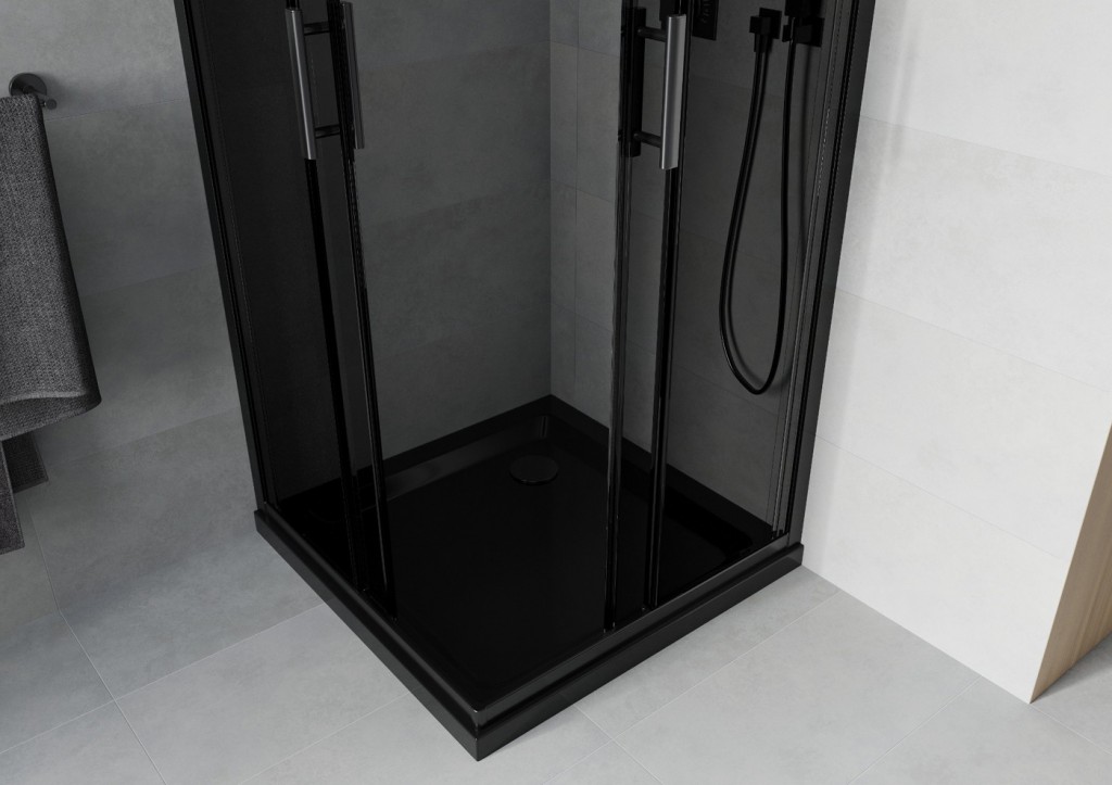 Štvorcový sprchovací kút z kolekcie Mexen RIO . Funkčné posuvné dvere so spoľahlivými valčekmi, ktoré zaručujú plynulé a tiché posúvanie. Obliečka na skle uľahčuje ich čistenie, takže si môžete dlhšie užívať dokonale priehľadné a lesklé sklo. Tvrdené a bezpečné sklo o sile a povrchové prvky dverí sú vyrobené z nerezového materiálu pokrytého povrchovou úpravou. Montáž je možná na podlahu alebo so sprchovou vaničkou.