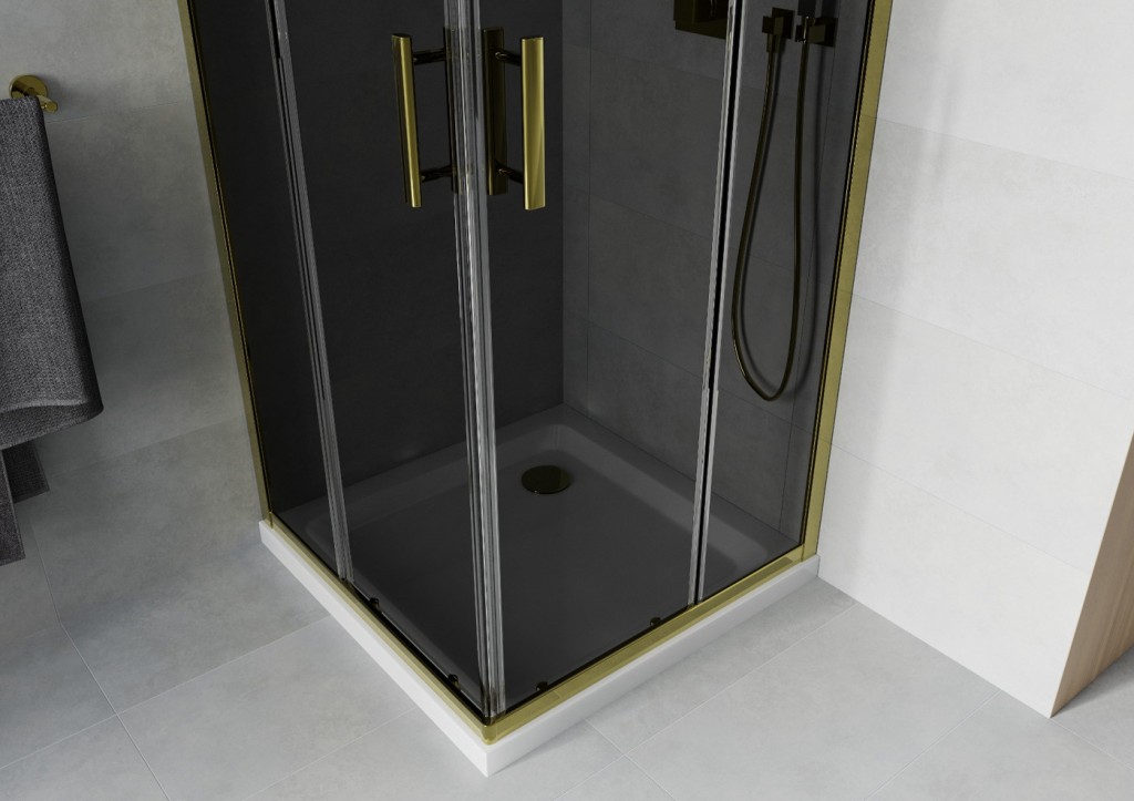 Štvorcový sprchovací kút z kolekcie Mexen RIO . Funkčné posuvné dvere so spoľahlivými valčekmi, ktoré zaručujú plynulé a tiché posúvanie. Obliečka na skle uľahčuje ich čistenie, takže si môžete dlhšie užívať dokonale priehľadné a lesklé sklo. Tvrdené a bezpečné sklo o sile a povrchové prvky dverí sú vyrobené z nerezového materiálu pokrytého povrchovou úpravou. Montáž je možná na podlahu alebo so sprchovou vaničkou.