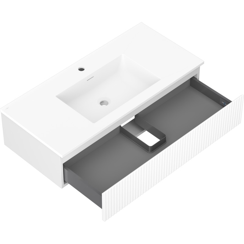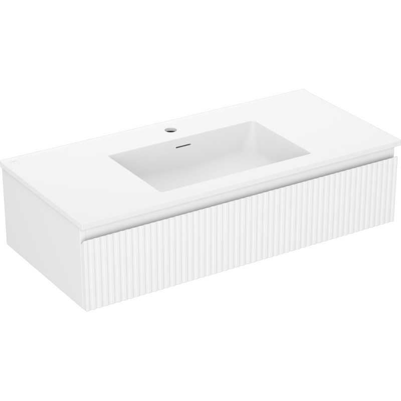 Špecifikácia produktu: Rozmery skrinky: Šírka: 100 cm Hĺbka: 46 cm Výška: 23,5 cm Farba korpusu: Matná biela Materiál korpusu: Lakovaná doska Farba čela: Matná biela Materiál čela: Lakovaná MDF doska Štruktúra čela: Drážkovaná Počet zásuviek Povrch odolný voči UV žiareniu Rozmery umývadla: Šírka: 101 cm Hĺbka: 46,5 cm Výška: 16,5 cm Farba umývadla: Matná biela Materiál umývadla: Konglomerát Otvor pre prepad: Áno Otvor pre batériu: Áno Zmontovaný výrobok