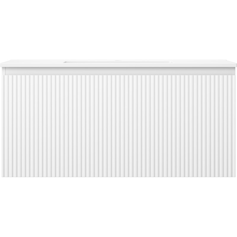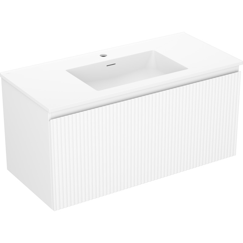 Špecifikácia produktu: Rozmery skrinky: Šírka: 100 cm Hĺbka: 46 cm Výška: 47 cm Farba korpusu: Matná biela Materiál korpusu: Lakovaná doska Farba čela: Matná biela Materiál čela: Lakovaná MDF doska Štruktúra čela: Drážkovaná Počet zásuviek: odolný voči UV žiareniu Rozmery umývadla: Šírka: 101 cm Hĺbka: 46,5 cm Výška: 16,5 cm Farba umývadla: Matná biela Materiál umývadla: Konglomerát Otvor pre prepad: Áno Otvor pre batériu: Áno Zmontovaný výrobok