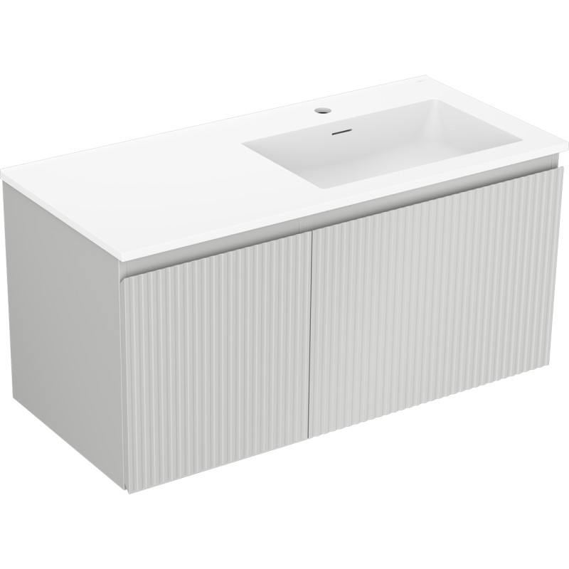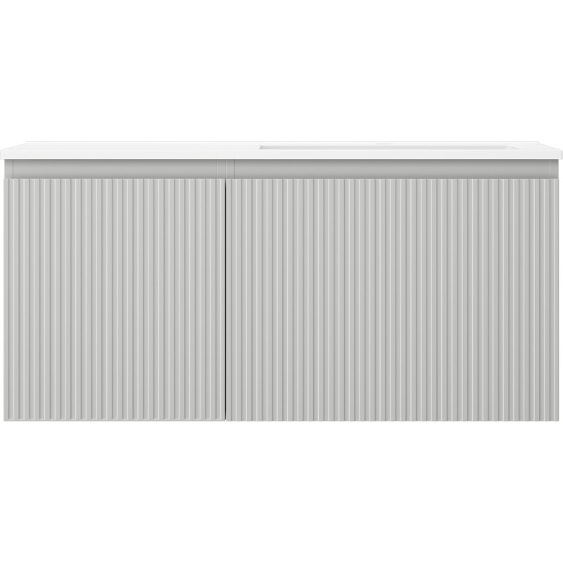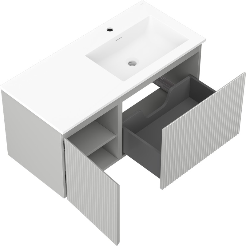 Špecifikácia produktu: Rozmery skrinky: Šírka: 100 cm Hĺbka: 46 cm Výška: 47 cm Sada obsahuje: Zásuvková skrinka pod umývadlo: Šírka: 60 cm Hĺbka: 46 cm Výška: 47 cm Farba korpusu: Matne šedá Materiál korpusu čelá: Lakovaná MDF doska Konštrukcia čela: Drážkovaná Počet zásuviek: 1 Priestranná zásuvka s funkciou tlmenia dovierania Povrch odolný proti UV žiareniu Skrinka pod umývadlo s dvierkami: Šírka: 40 cm Výška: 47 cm Hĺbka: 46 cm Farba korusta čelá: Matne šedá Materiál čela: Lakovaná MDF doska Konštrukcia čela: Drážkovaná Počet dvierok: 1 1 polica Panty s funkciou tlmenia dovierania Univerzálna montáž dvierok (ľavé/pravé) Povrch odolný proti UV žiareniu Umývadlo: Šírka: 101 cm Hĺbka: 101 cm Hĺbka umývadlá: Matne biela Materiál umývadla: Konglomerát Otvor na prepad: Áno Otvor na batériu: Áno Zmontovaný výrobok
