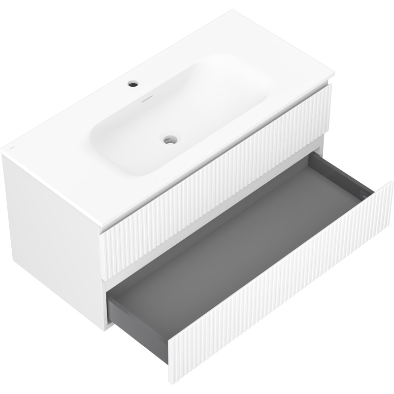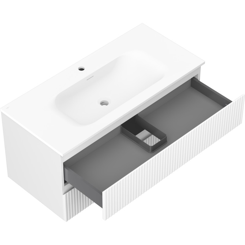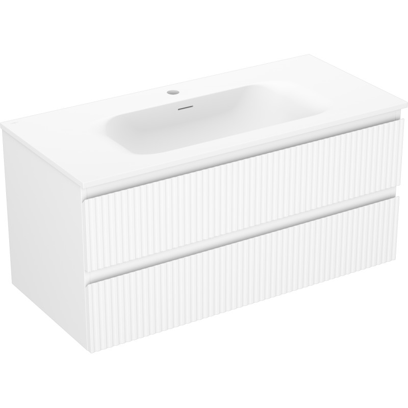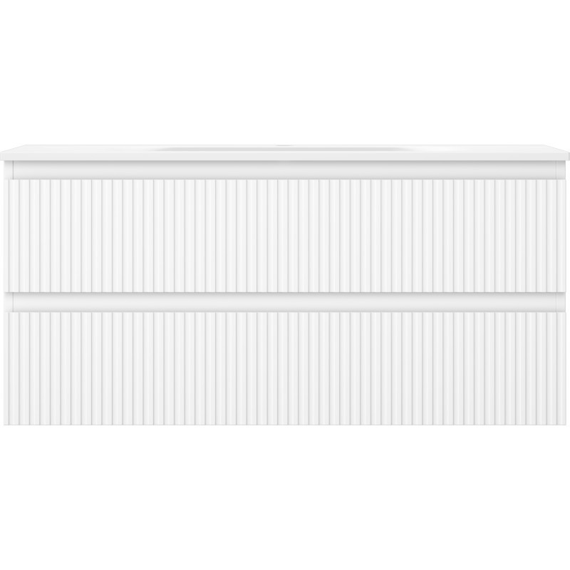 Špecifikácia produktu: Rozmery skrinky: Šírka: 100 cm Hĺbka: 46 cm Výška: 47 cm Farba korpusu: Matná biela Materiál korpusu: Lakovaná doska Farba čela: Matná biela Materiál čela: Lakovaná MDF doska Štruktúra čela: Drážkovaná Počet zásuviek: Povrch odolný voči UV žiareniu Rozmery umývadla: Šírka: 101 cm Hĺbka: 46,5 cm Výška: 16,5 cm Farba umývadla: Matná biela Materiál umývadla: Konglomerát Otvor pre prepad: Áno Otvor pre batériu: Áno Zmontovaný výrobok