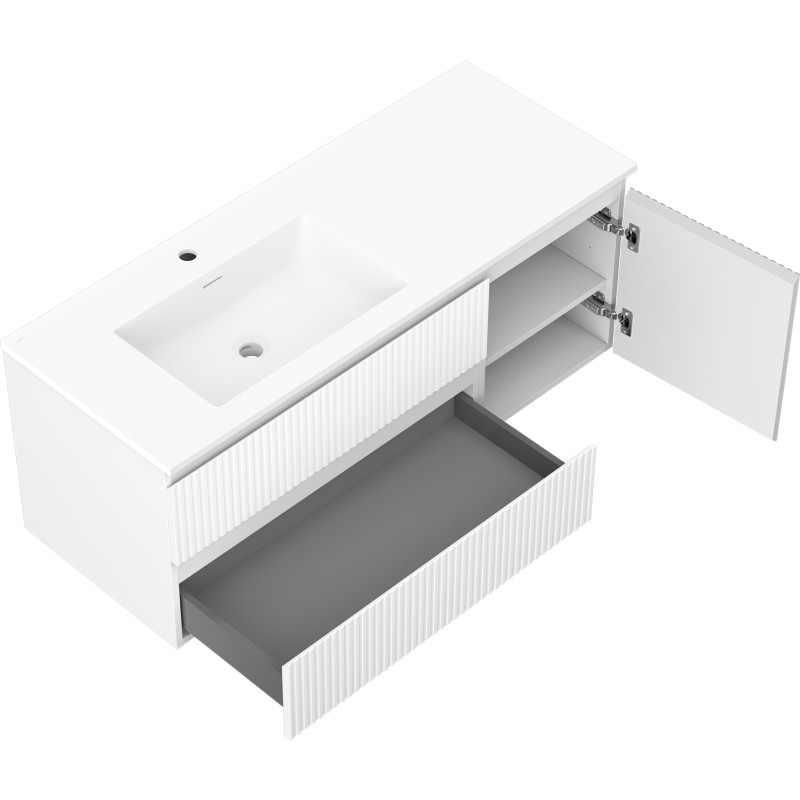 Špecifikácia produktu: Rozmery skrinky: Šírka: 120 cm Hĺbka: 46 cm Výška: 47 cm Sada obsahuje: Zásuvková skrinka pod umývadlo: Šírka: 80 cm Hĺbka: 46 cm Výška: 47 cm Farba korpusu: Matná biela Materiál korpus čela: Lakovaná MDF doska Konštrukcia čela: Drážkovaná Počet zásuviek: 2 Priestranná zásuvka s funkciou tlmeného dovierania Umývadlová skrinka s dvierkami: Šírka: 40 cm Výška: 47 cm Hĺbka: 46 cm Farba korpusu: Matná biela Materiál čelá: Lakovaná MDF doska Konštrukcia čela: Drážkovaná Počet dvierok: 1 1 polica Pánty s funkciou tlmeného dovierania Univerzálna montáž dvierok (ľavé/pravé) Povrch odolný voči UV žiareniu Umývadlo: Šírka: 121 cm Hĺbka: 46,5 cm Výška Materiál umývadla: Konglomerát Otvor pre prepad: Áno Otvor pre batériu: Áno Výrobok zmontovaný