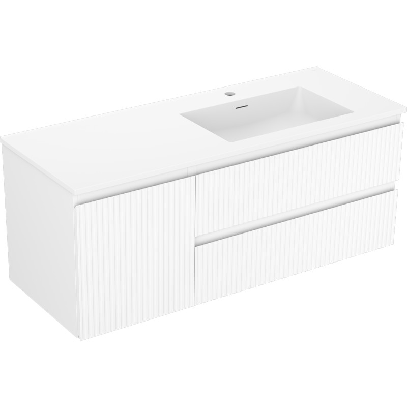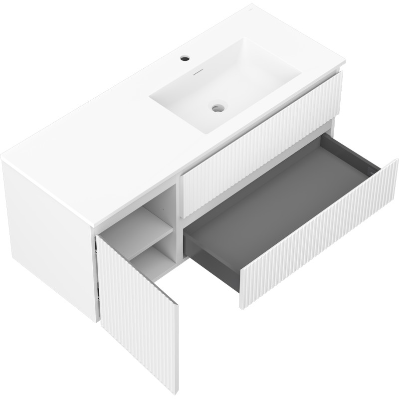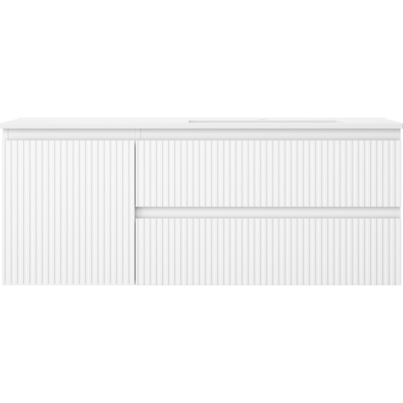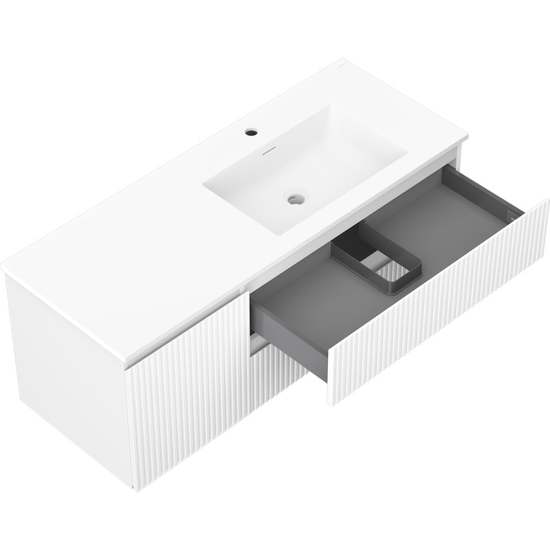 Špecifikácia produktu: Rozmery skrinky: Šírka: 120 cm Hĺbka: 46 cm Výška: 47 cm Sada obsahuje: Zásuvková skrinka pod umývadlo: Šírka: 80 cm Hĺbka: 46 cm Výška: 47 cm Farba korpusu: Matná biela Materiál korpus čela: Lakovaná MDF doska Konštrukcia čela: Drážkovaná Počet zásuviek: 2 Priestranná zásuvka s funkciou tlmeného dovierania Umývadlová skrinka s dvierkami: Šírka: 40 cm Výška: 47 cm Hĺbka: 46 cm Farba korpusu: Matná biela Materiál čelá: Lakovaná MDF doska Konštrukcia čela: Drážkovaná Počet dvierok: 1 1 polica Pánty s funkciou tlmeného dovierania Univerzálna montáž dvierok (ľavé/pravé) Povrch odolný voči UV žiareniu Umývadlo: Šírka: 121 cm Hĺbka: 46,5 cm Výška Materiál umývadla: Konglomerát Otvor pre prepad: Áno Otvor pre batériu: Áno Výrobok zmontovaný