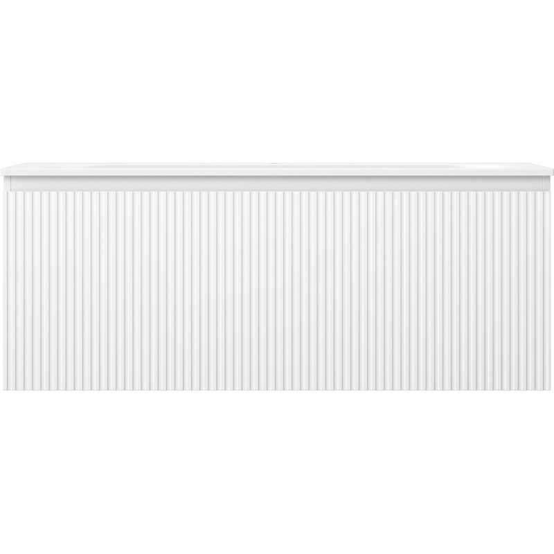 Špecifikácia produktu: Rozmery skrinky: Šírka: 120 cm Hĺbka: 46 cm Výška: 47 cm Farba korpusu: Matná biela Materiál korpusu: Lakovaná doska Farba čela: Matná biela Materiál čela: Lakovaná MDF doska Štruktúra čela: Drážkovaná Počet zásuviek: Povrch odolný voči UV žiareniu Rozmery umývadla: Šírka: 121 cm Hĺbka: 46,5 cm Výška: 16,5 cm Farba umývadla: Matná biela Materiál umývadla: Konglomerát Otvor na prepad: Áno Otvor na batériu: Áno Zmontovaný výrobok