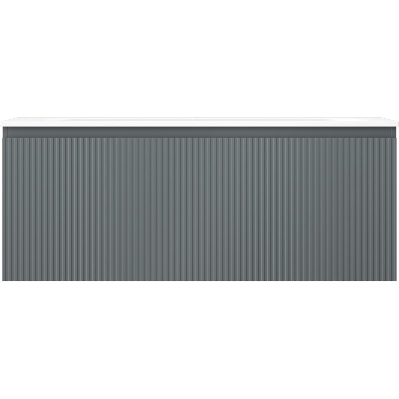 Špecifikácia produktu: Rozmery skrinky: Šírka: 120 cm Hĺbka: 46 cm Výška: 47 cm Farba korpusu: Matný grafit Materiál korpusu: Lakovaná doska Farba čela: Matný grafit Materiál čela: Lakovaná MDF doska Štruktúra čela: Drážkovaná Počet zásuviek: Povrch odolný voči UV žiareniu Rozmery umývadla: Šírka: 121 cm Hĺbka: 46,5 cm Výška: 16,5 cm Farba umývadla: Matná biela Materiál umývadla: Konglomerát Otvor na prepad: Áno Otvor na batériu: Áno Zmontovaný výrobok