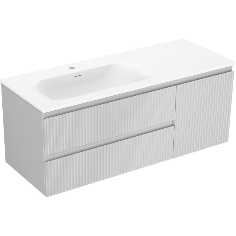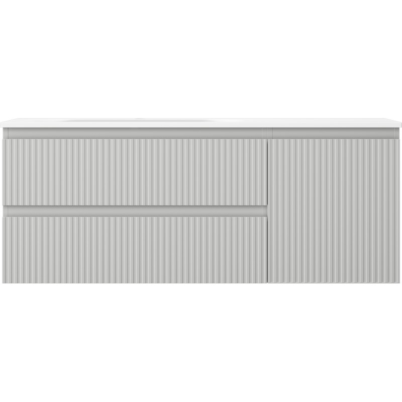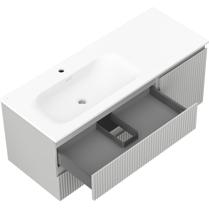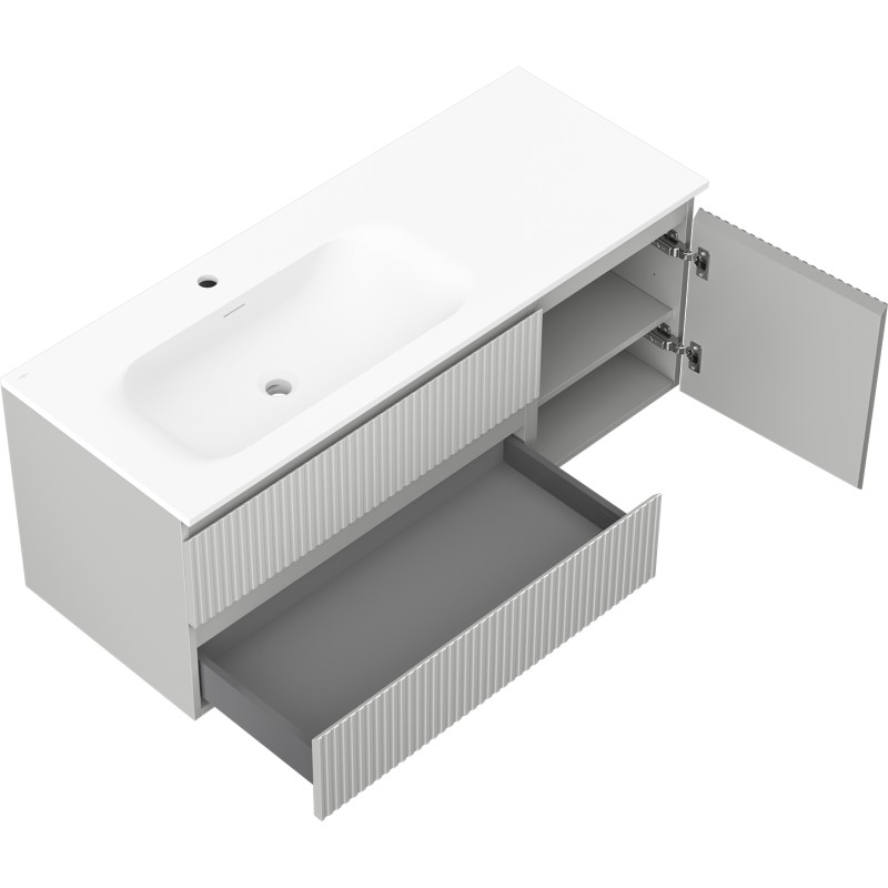Špecifikácia produktu: Rozmery skrinky: Šírka: 120 cm Hĺbka: 46 cm Výška: 47 cm Sada obsahuje: Zásuvková skrinka pod umývadlo: Šírka: 80 cm Hĺbka: 46 cm Výška: 47 cm Farba korpusu: Matne šedá Materiál korpusu čela: Lakovaná MDF doska Konštrukcia čela: Drážkovaná Počet zásuviek: 2 Priestranná zásuvka s funkciou tlmenia dovierania Povrch odolný proti UV žiareniu Skrinka pod umývadlo s dvierkami: Šírka: 40 cm Výška: 47 cm Hĺbka: 46 cm Farba korusta čela: Matne šedá Materiál čela: Lakovaná MDF doska Konštrukcia čela: Drážkovaná Počet dvierok: 1 1 polica Panty s funkciou tlmenia dovierania Univerzálna montáž dvierok (ľavé/pravé) Povrch odolný proti UV žiareniu Umývadlo: Šírka: 121 cm Hĺbka: 121 cm Hĺbka umývadlá: Matne biela Materiál umývadla: Konglomerát Otvor na prepad: Áno Otvor na batériu: Áno Zmontovaný výrobok