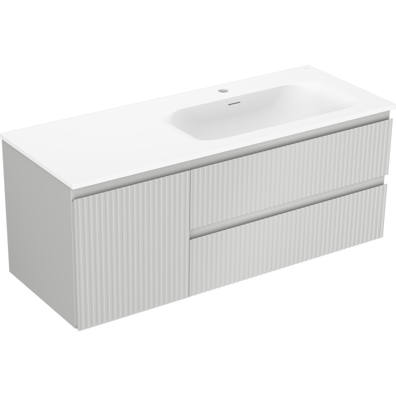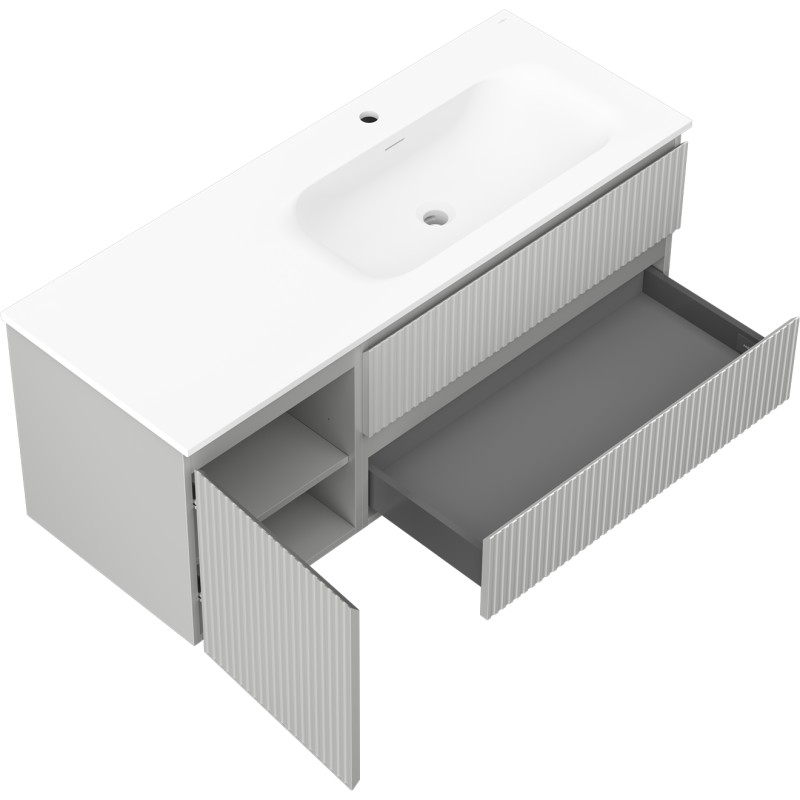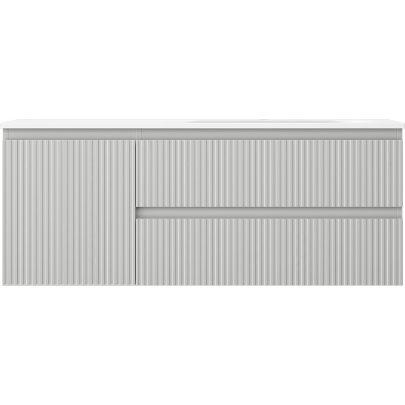 Špecifikácia produktu: Rozmery skrinky: Šírka: 120 cm Hĺbka: 46 cm Výška: 47 cm Sada obsahuje: Zásuvková skrinka pod umývadlo: Šírka: 80 cm Hĺbka: 46 cm Výška: 47 cm Farba korpusu: Matne šedá Materiál korpusu čela: Lakovaná MDF doska Konštrukcia čela: Drážkovaná Počet zásuviek: 2 Priestranná zásuvka s funkciou tlmenia dovierania Povrch odolný proti UV žiareniu Skrinka pod umývadlo s dvierkami: Šírka: 40 cm Výška: 47 cm Hĺbka: 46 cm Farba korusta čela: Matne šedá Materiál čela: Lakovaná MDF doska Konštrukcia čela: Drážkovaná Počet dvierok: 1 1 polica Panty s funkciou tlmenia dovierania Univerzálna montáž dvierok (ľavé/pravé) Povrch odolný proti UV žiareniu Umývadlo: Šírka: 121 cm Hĺbka: 121 cm Hĺbka umývadlá: Matne biela Materiál umývadla: Konglomerát Otvor na prepad: Áno Otvor na batériu: Áno Zmontovaný výrobok