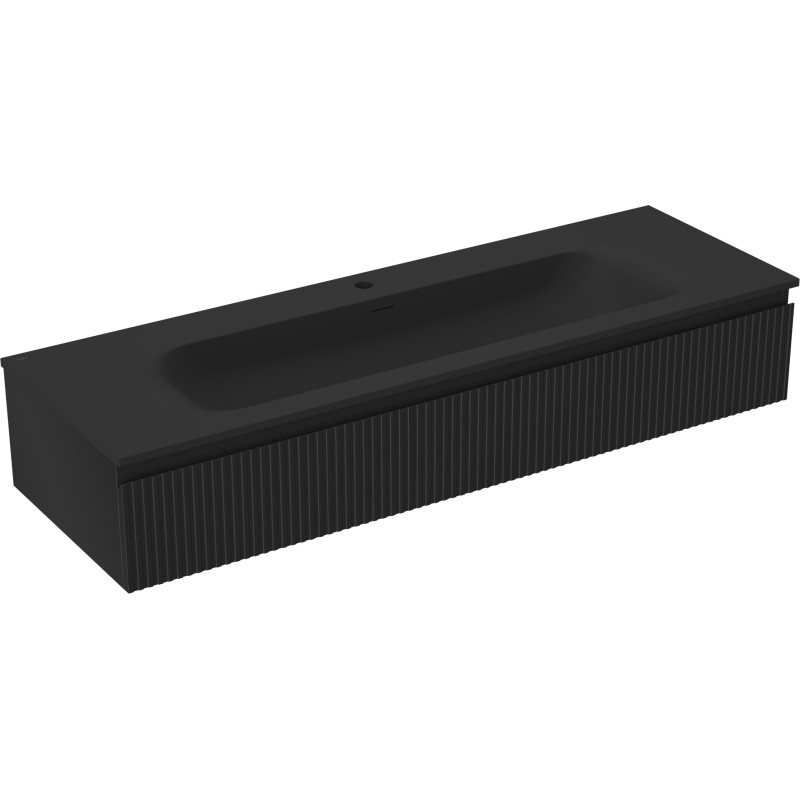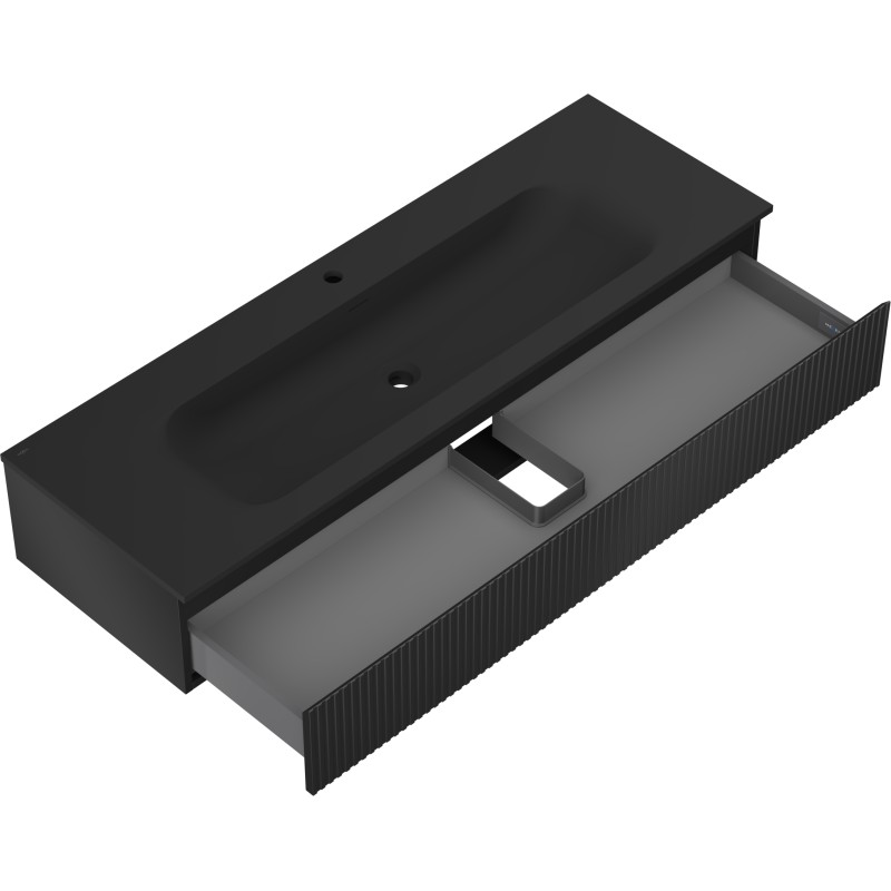 Špecifikácia produktu: Rozmery skrinky: Šírka: 140 cm Hĺbka: 46 cm Výška: 23,5 cm Farba korpusu: Matná čierna Materiál korpusu: Lakovaná doska Farba čela: Matná čierna Materiál čela: Lakovaná MDF doska Štruktúra čela: Drážkovaná Počet zásuviek: 1 UV žiarenie Rozmery umývadla: Šírka: 141 cm Hĺbka: 46,5 cm Výška: 16,5 cm Farba umývadla: Matná čierna Materiál umývadla: Konglomerát Otvor na prepad: Áno Otvor na batériu: Áno Zmontovaný výrobok
