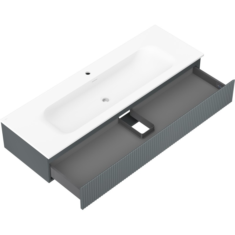 Špecifikácia produktu: Rozmery skrinky: Šírka: 140 cm Hĺbka: 46 cm Výška: 23,5 cm Farba korpusu: Matný grafit Materiál korpusu: Lakovaná doska Farba čela: Matný grafit Materiál čela: Lakovaná MDF doska Štruktúra čela: Drážkovaná Počet zásuviek Povrch odolný voči UV žiareniu Rozmery umývadla: Šírka: 141 cm Hĺbka: 46,5 cm Výška: 16,5 cm Farba umývadla: Matná biela Materiál umývadla: Konglomerát Otvor na prepad: Áno Otvor na batériu: Áno Zmontovaný výrobok