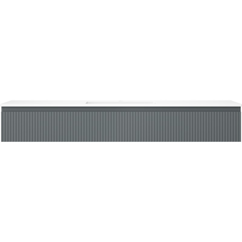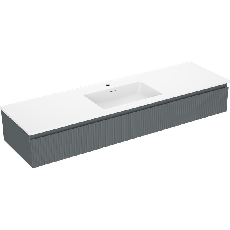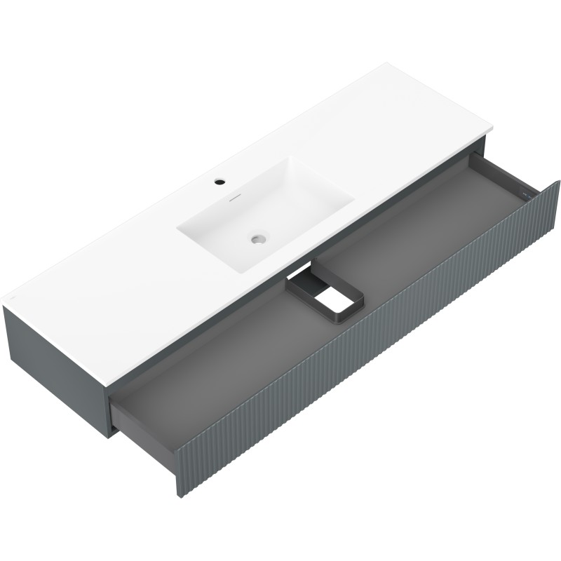 Špecifikácia produktu: Rozmery skrinky: Šírka: 160 cm Hĺbka: 46 cm Výška: 23,5 cm Farba korpusu: Matný grafit Materiál korpusu: Lakovaná doska Farba čela: Matný grafit Materiál čela: Lakovaná MDF doska Štruktúra čela: Drážkovaná Počet zásuviek Povrch odolný voči UV žiareniu Rozmery umývadla: Šírka: 161 cm Hĺbka: 46,5 cm Výška: 16,5 cm Farba umývadla: Matná biela Materiál umývadla: Konglomerát Otvor na prepad: Áno Otvor na batériu: Áno Zmontovaný výrobok