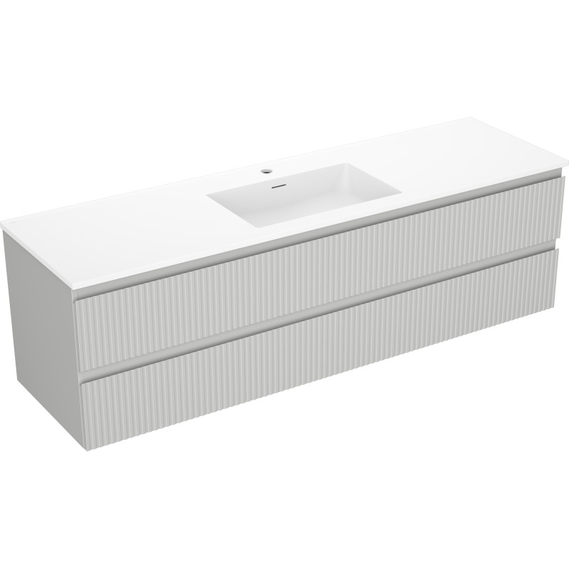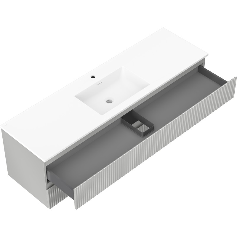 Špecifikácia produktu: Rozmery skrinky: Šírka: 160 cm Hĺbka: 46 cm Výška: 47 cm Farba korpusu: Matne šedá Materiál korpusu: Lakovaná doska Farba čela: Matne šedá Materiál čela: Lakovaná MDF doska Štruktúra čela: Drážkovaná Počet zásuviek: 2 voči UV žiareniu Rozmery umývadla: Šírka: 161 cm Hĺbka: 46,5 cm Výška: 16,5 cm Farba umývadla: Matne biela Materiál umývadla: Konglomerát Otvor pre prepad: Áno Otvor pre batériu: Áno Zmontovaný výrobok