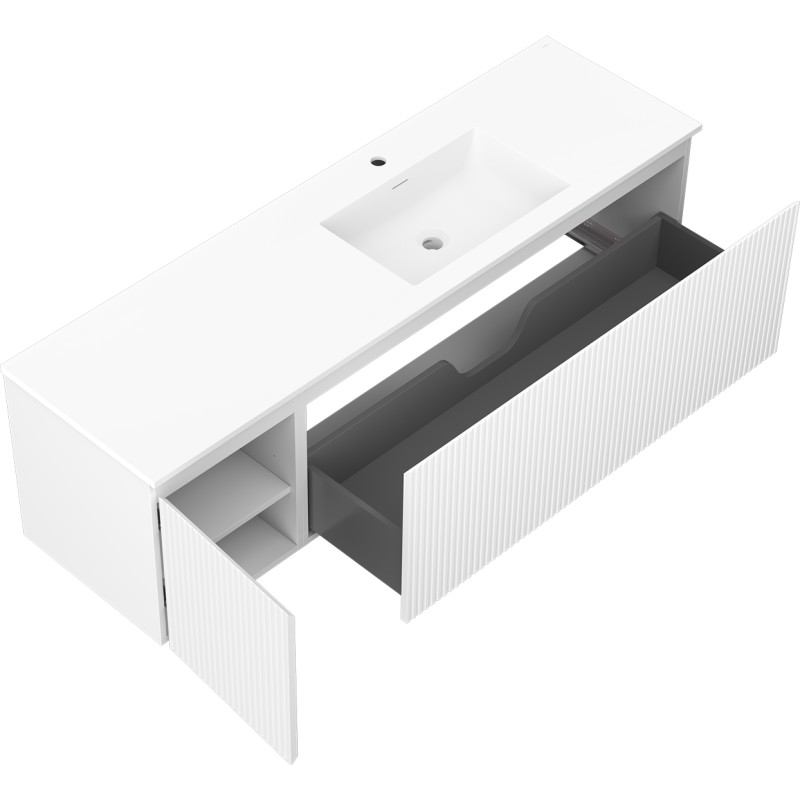 Špecifikácia produktu: Rozmery skrinky: Šírka: 160 cm Hĺbka: 46 cm Výška: 47 cm Sada obsahuje: Zásuvková skrinka pod umývadlo: Šírka: 120 cm Hĺbka: 46 cm Výška: 47 cm Farba korpusu Matná biela Materiál korpus čela: Lakovaná MDF doska Konštrukcia čela: Drážkovaná Počet zásuviek: 1 Priestranná zásuvka s funkciou tlmenia dovierania Umývadlová skrinka s dvierkami: Šírka: 40 cm Výška: 47 cm Hĺbka: 46 cm Farba korpusu: Matná biela Materiál čelá: Lakovaná MDF doska Konštrukcia čela: Drážkovaná Počet dvierok: 1 1 polica Pánty s funkciou tlmenia dovierania Univerzálna montáž dvierok (ľavé/pravé) Povrch odolný voči UV žiareniu Umývadlo: Šírka: 161 cm Hĺbka: 46,5 cm Výška Materiál umývadla: Konglomerát Otvor pre prepad: Áno Otvor pre batériu: Áno Výrobok zmontovaný