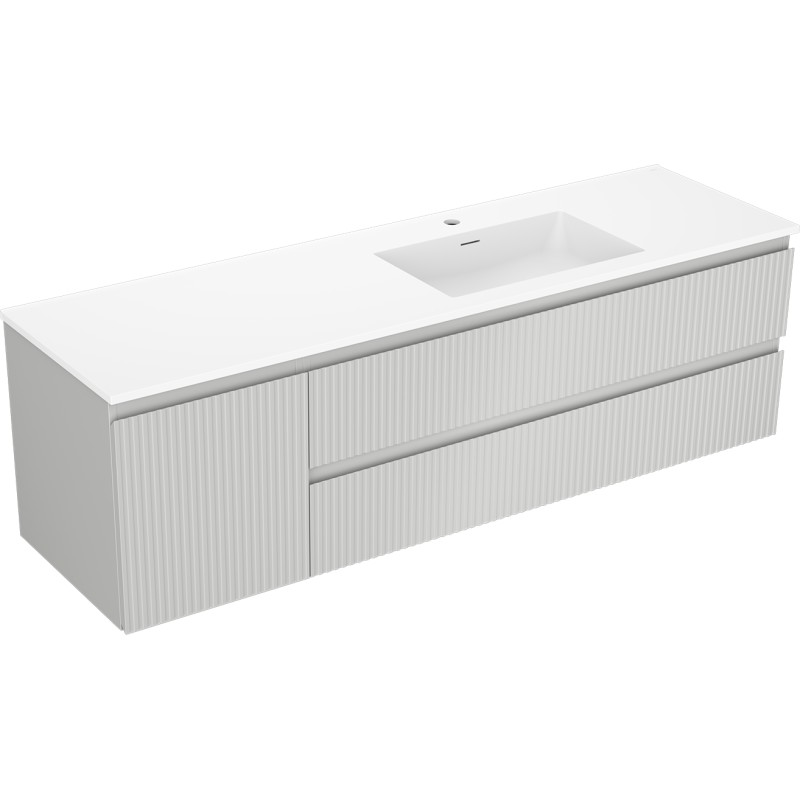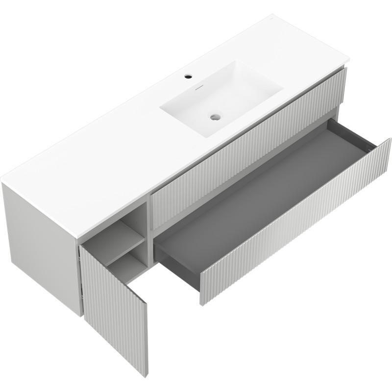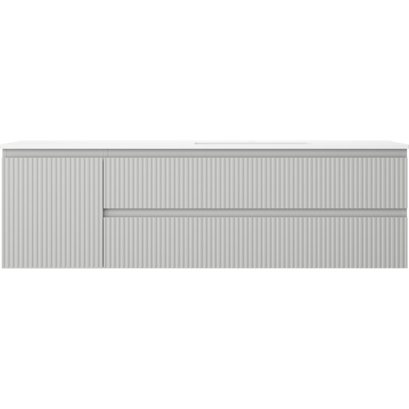 Špecifikácia produktu: Rozmery skrinky: Šírka: 160 cm Hĺbka: 46 cm Výška: 47 cm Sada obsahuje: Zásuvková skrinka pod umývadlo: Šírka: 120 cm Hĺbka: 46 cm Výška: 47 cm Farba korpusu: Matne šedá Materiál korpus čela: Lakovaná MDF doska Konštrukcia čela: Drážkovaná Počet zásuviek: 2 Priestranná zásuvka s funkciou tlmeného dovierania Umývadlová skrinka s dvierkami: Šírka: 40 cm Výška: 47 cm Hĺbka: 46 cm Farba korpusu Matne šedá Materiál korpus čelá: Lakovaná MDF doska Konštrukcia čela: Drážkovaná Počet dvierok: 1 1 polica Pánty s funkciou tlmeného dovierania Univerzálna montáž dvierok (ľavé/pravé) Povrch odolný voči UV žiareniu Umývadlo: Šírka: 161 cm Hĺbka: 46,5 cm Výška Materiál umývadla: Konglomerát Otvor na prepad: Áno Otvor na batériu: Áno Produkt zmontovaný